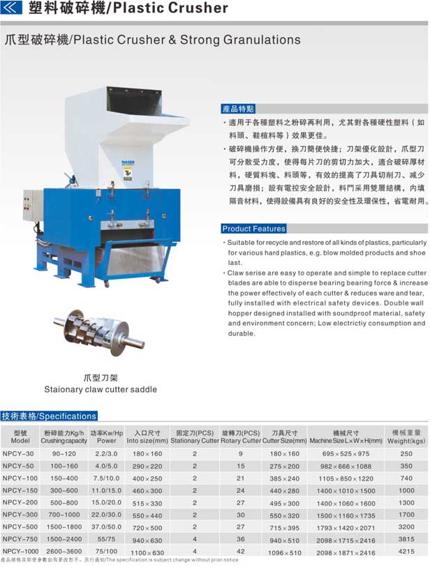 適用于各種逆料之粉碎再利用,尤其對各類硬性塑料(如料頭,鞋楦料等)效果更佳。NPCY系列破碎機操作方便,換刀簡便快捷;刀架優(yōu)化設計,爪型刀可分散受力度,便得每片刀和剪切力加大,適合破碎厚材料,硬質料塊,料頭等,有效的提高了刀具切削力,減少刀具磨損;設有電控按全設計,料頭采用雙層結構,內(nèi)填隔音材料,使得設備具有良好的安全性及環(huán)保性,省電耐用。
